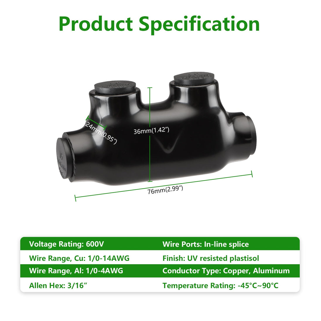 3. This wire splice connector is made from sturdy 6061-T6 aluminum CU9AL for durability and is insulated with high dielectric strength plastisol for enhanced chemical and abrasion protection.