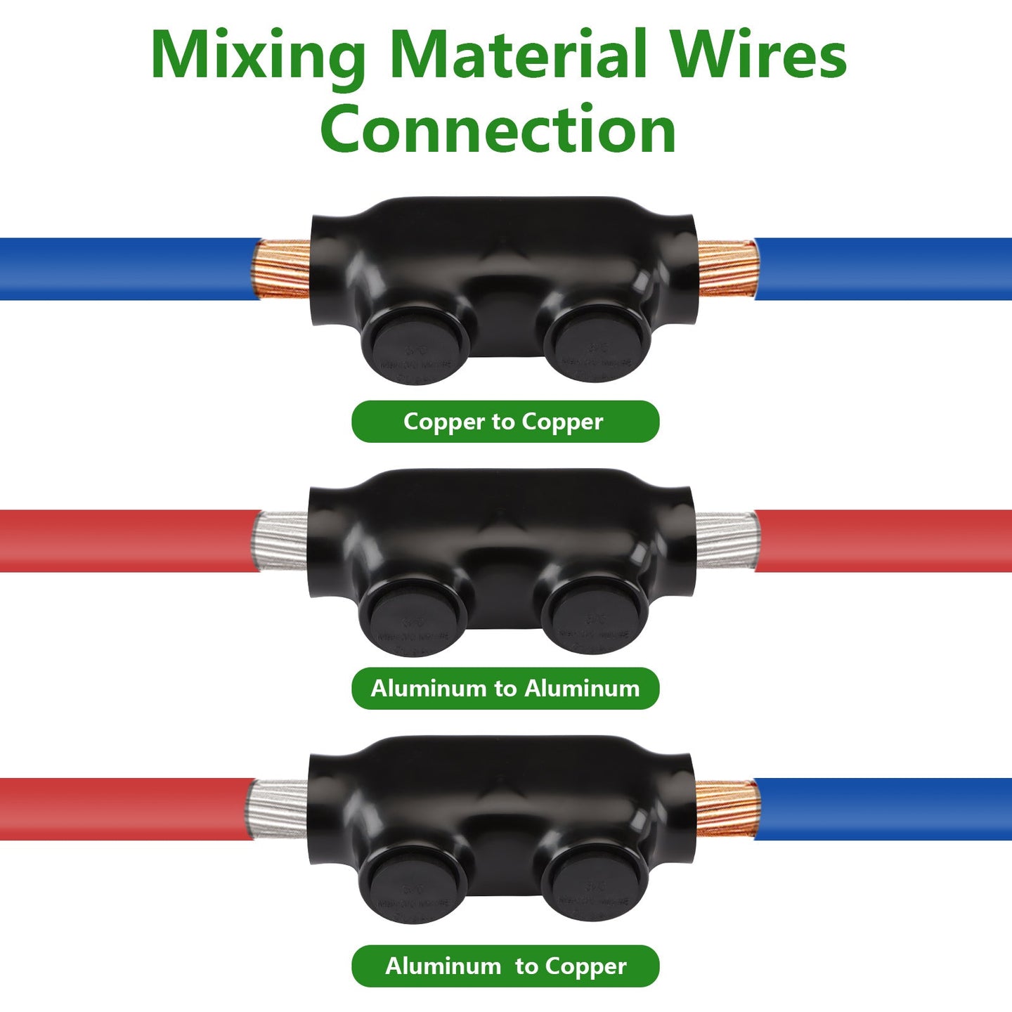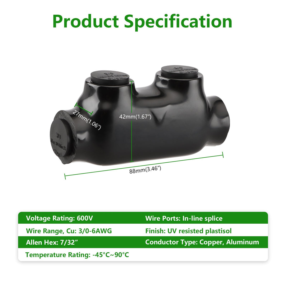 3. This wire splice connector is made from sturdy 6061-T6 aluminum CU9AL for durability and is insulated with high dielectric strength plastisol for enhanced chemical and abrasion protection.