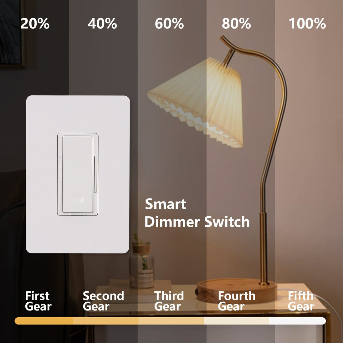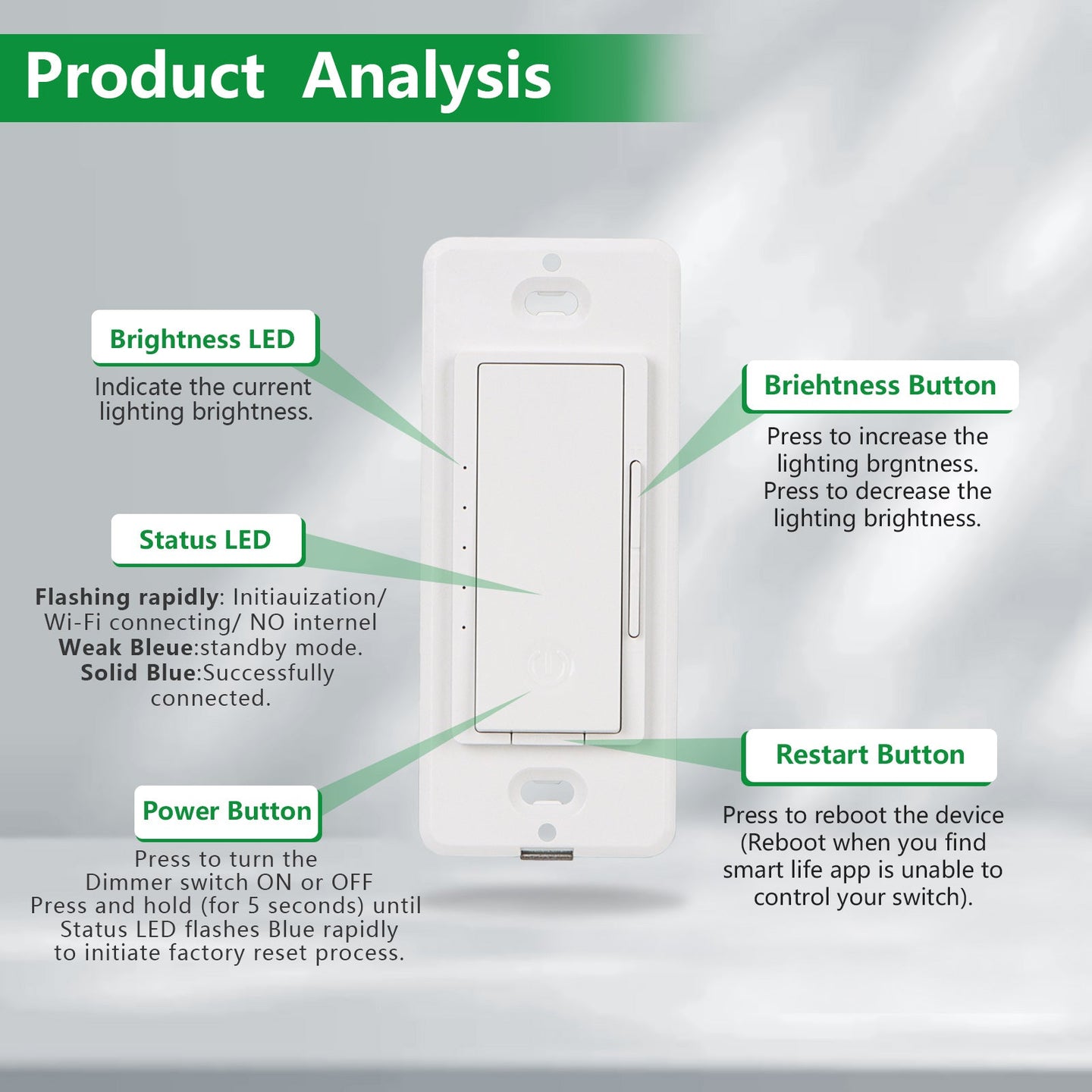 1. This smart dimmer switch supports 0%-100% light brightness adjustment. Users can adjust the required brightness through mobile app, voice control or manual button. At the same time, it has a brightness memory function that can remember the last light setting. Supports up to 150W dimmable LED/CFL or 350W incandescent lamps, but smart bulbs cannot be dimmed through smart dimmer switches.