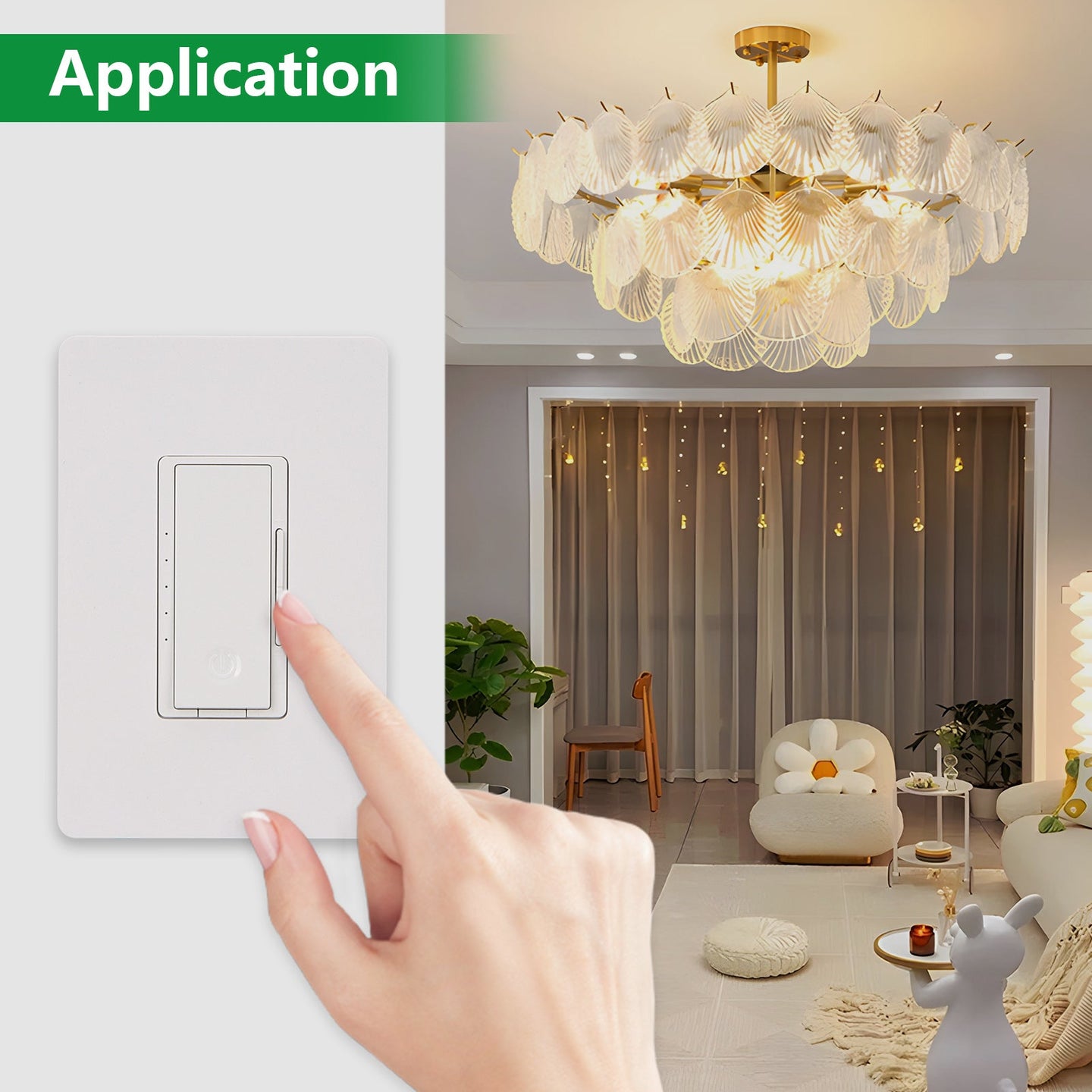 This WiFi dimmer switch is a smart dimmer switch that can remotely control and adjust the brightness of lights through a WiFi connection. Through a WiFi network connection, users can remotely control the switch using a smartphone, tablet or other networked device. Allows users to adjust the brightness of the light to achieve different lighting effects and energy-saving needs. Compatible with smart home platforms such as Amazon Alexa, Google Assistant, etc., supports voice control and linkage with other smart devices. Through dedicated mobile applications (such as the Smart Life app or Tuya app), users can control the switch status and brightness settings of the switch anytime, anywhere. Users can set timed tasks or scene modes to automatically adjust the light brightness or switch status at specific times to improve life convenience and energy saving effects. Compatible with standard wall switch boxes, it can usually directly replace traditional dimmer switches and is easy to install