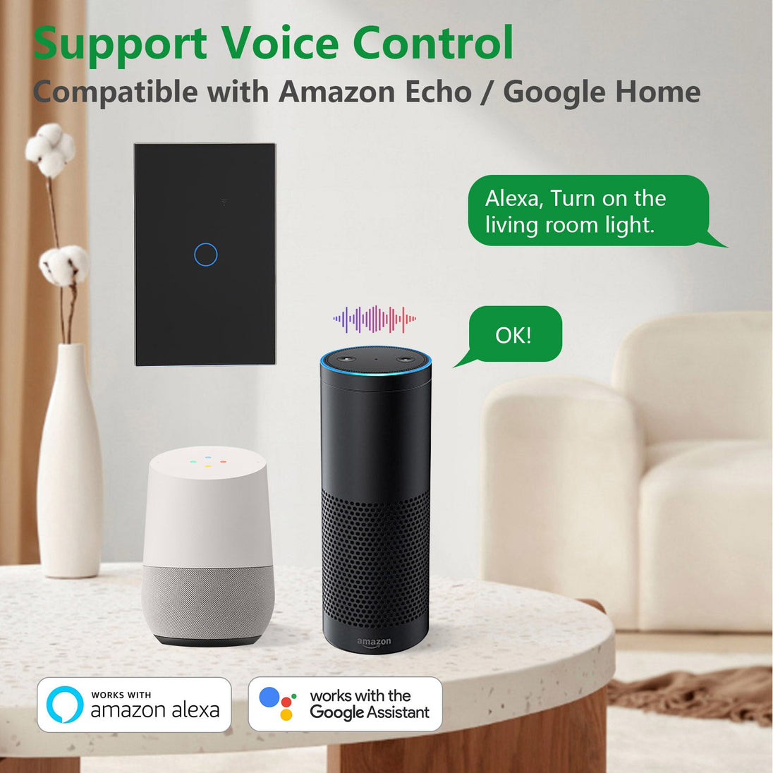 4. This touch light switch is compatible with Amazon Alexa Echo, Google Assistant. Pair the touch switch with Amazon Alexa or Google Home, and you can turn the lights on or off with your voice, no hub required.