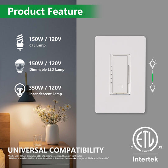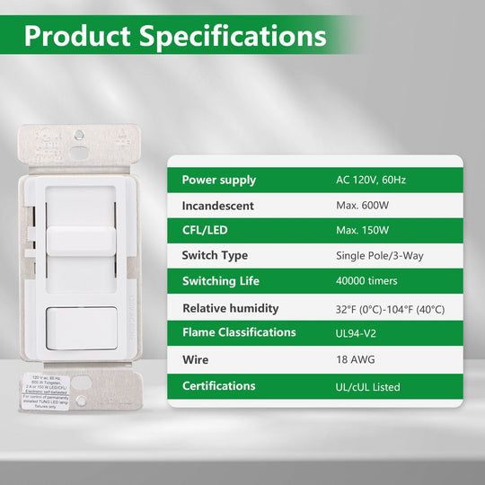 Wengart Dimmer Switch,Single Pole/3-Way,150W Dimmable LED/CFL Lights,Halogen and Incandescent Bulbs 600W Max,AC120V,Cover Plate Included,UL Listed,White