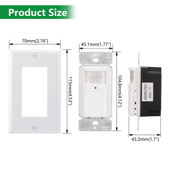 Wengart PIR Motion Sensor Light Switch,120VAC Single Pole,180° Sensor Coverage Neutral Wire Required