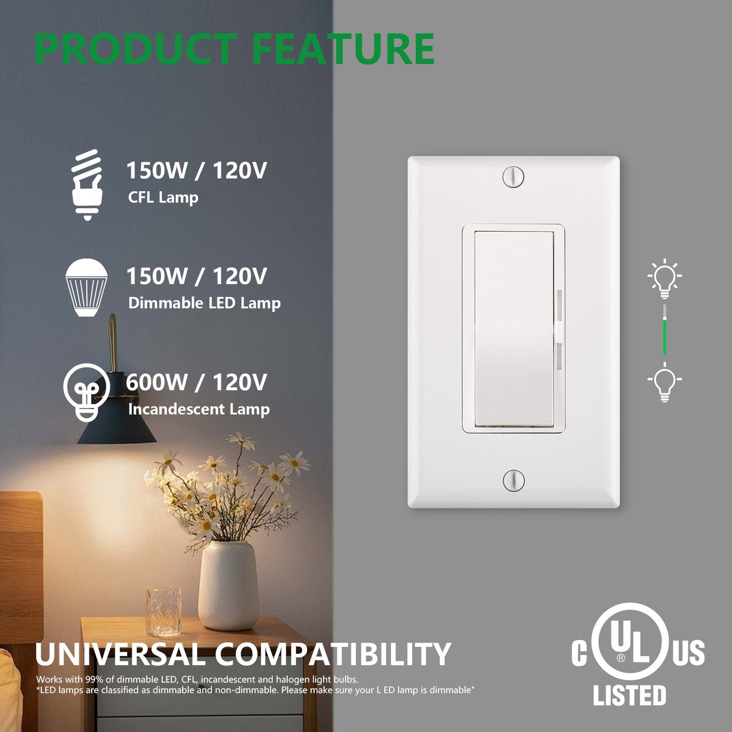 Wengart Dimmer Switch,Single Pole/3-Way,150W Dimmable LED/CFL Lights,Halogen and Incandescent Bulbs 600W Max,AC120V,Cover Plate Included,UL Listed,White