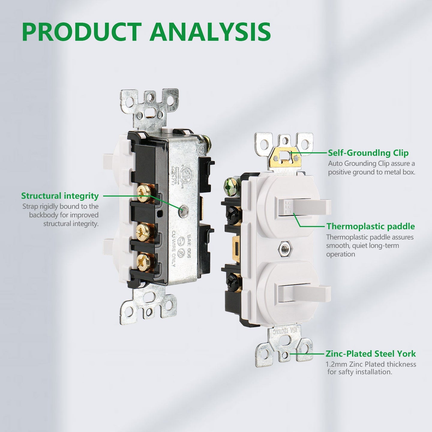 3. The toggle light switch is constructed of high-quality materials, including impact-resistant polycarbonate thermoplastic and solid steel, for long life and smooth, quiet switching action.
