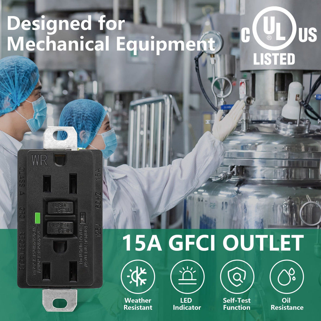 This GFCI receptacle is made of nylon material resistant to oil pollution, suitable for industrial-grade machinery or equipment, designed without output terminals, in line with industrial-grade high-quality standards and safe operation