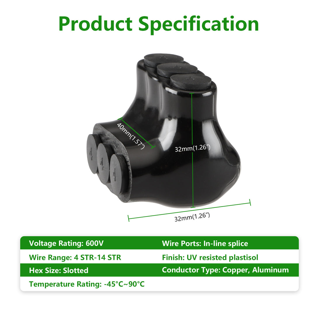 3. This wire splice connector is made from sturdy 6061-T6 aluminum CU9AL for durability and is insulated with high dielectric strength plastisol for enhanced chemical and abrasion protection.