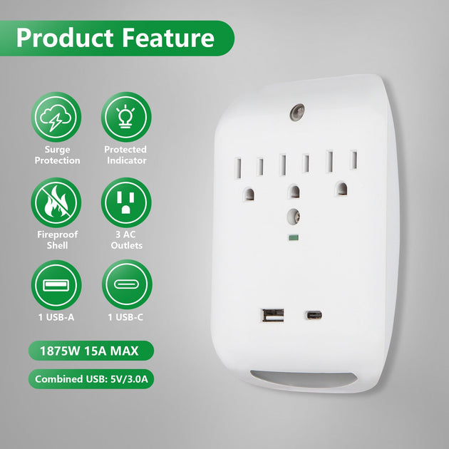 Wengart Multi Plug Outlet Extender BCU-002,125VAC 15A Automatic Night Light Surge Protector