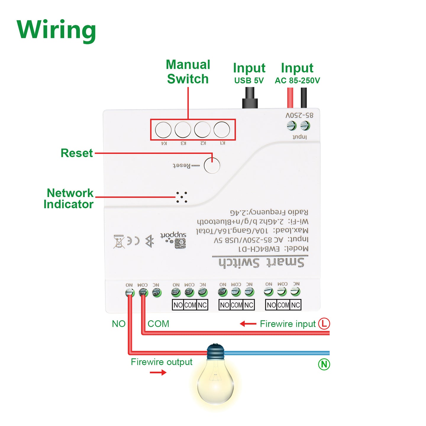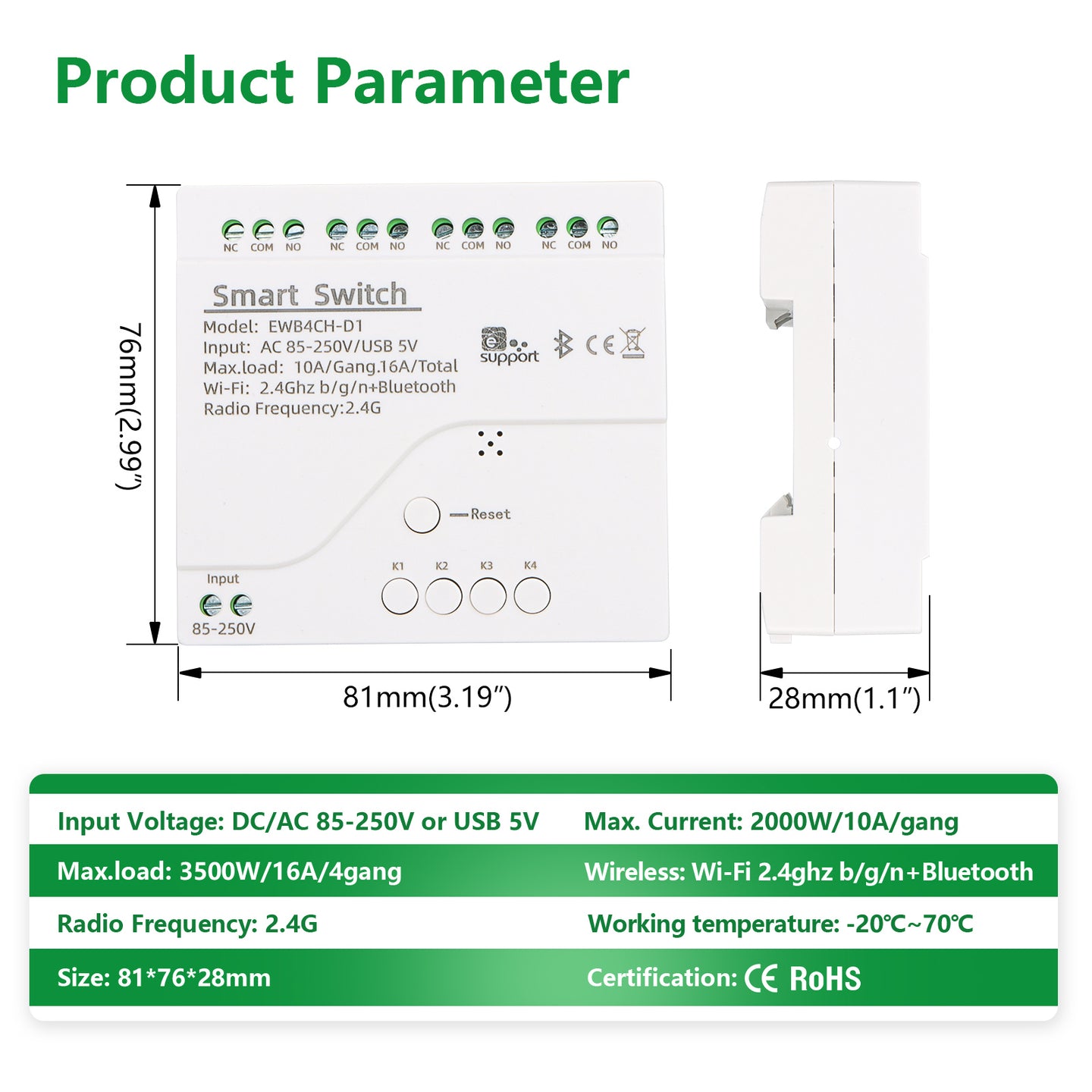 - Three working modes: This WiFi smart switch has a self-locking mode that enables independent control of four devices, an interlocking mode that ensures that only one device is in the on state, and an inching mode that supports automatic timed shutdown